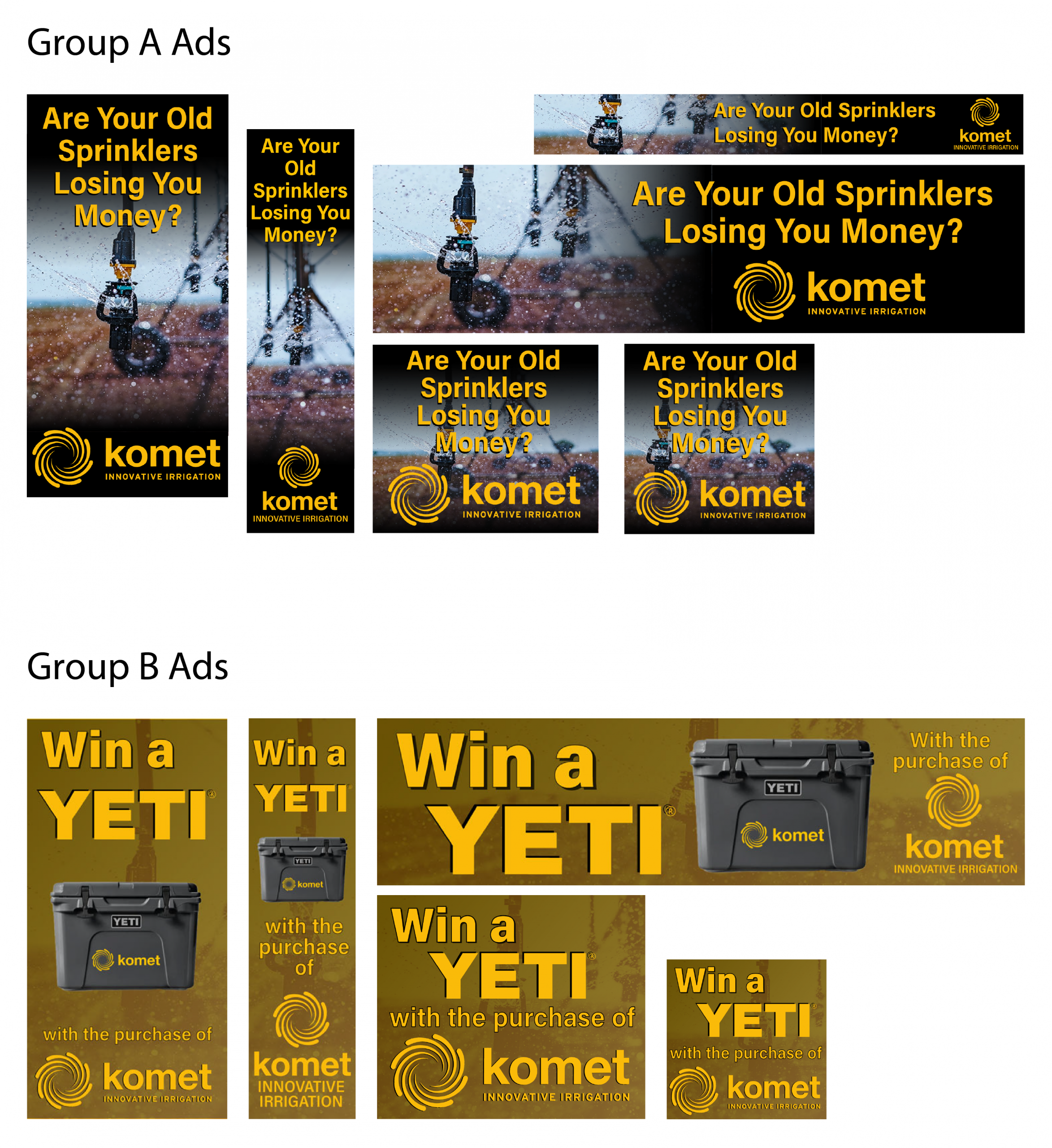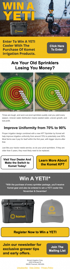Komet Sprinklers were looking to increase thier sales in the American Market. They wanted to run a campaign that would give away a Yeti cooler and other Komet branded prizes for those who purchased through the campaign. Our job was to raise awareness and engagement of this campaign. We did so by using a targeted list of farmers and sending emails and digital ads to them.